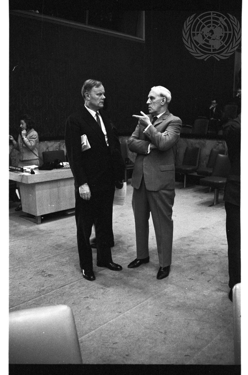 Conversing, prior to the meeting, are Patrick Dean (left) of the United Kingdom, and Alexander MacFarquhar, Under-Secretary for the United Nations Office of Personnel.