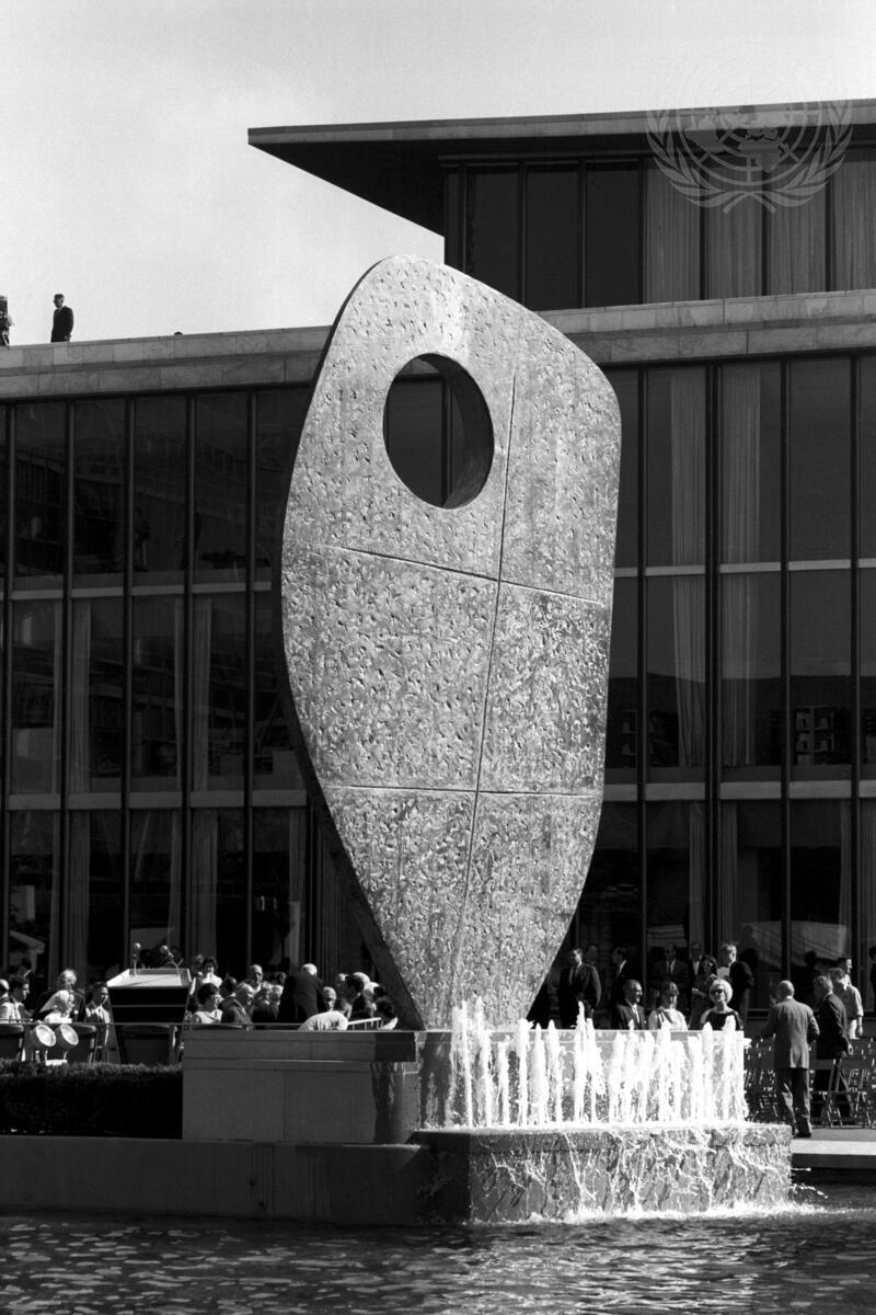 A 21-foot-high abstract sculpture, entitled ""Single Form"" and dedicated to the memory of Dag Hammarskjöld, was unveiled at United Nations Headquarters this afternoon during a ceremony presided over by United Nations Secretary-General U Thant. The sculpture, mounted on a granite base at the southern edge of the circular basin facing the 38-story Secretariat building, was executed by Barbara Hepworth, a British sculptress. It is a gift of Jacob Blaustein, former U.S. delegate to the United Nations and friend of the late Secretary-General.