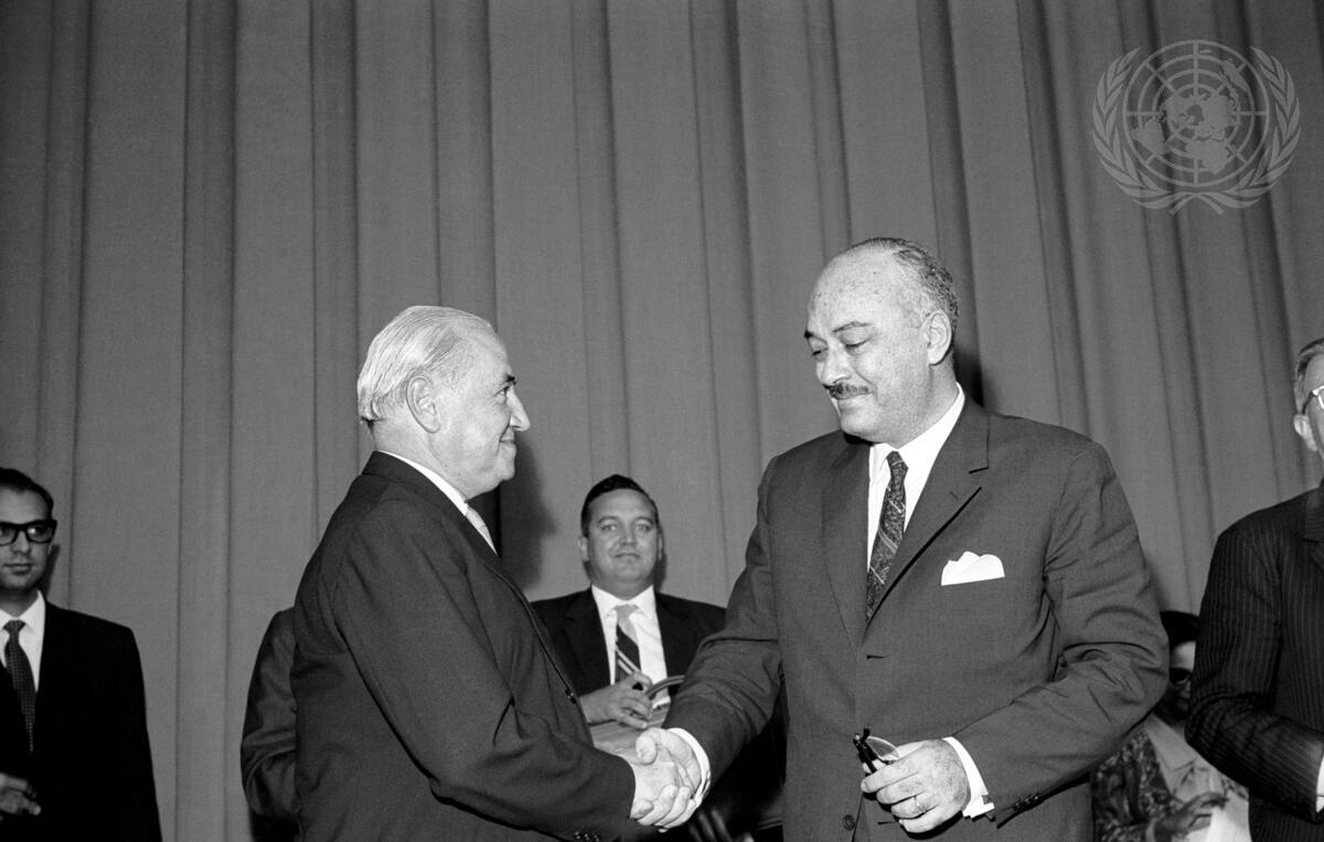 (Left) Secretary-General of the Conference, Raúl Prebisch, shaking hands with Mr. Abdel Moneim El-Kaissouni (UAR), President of the Conference, at the conclusion of the meeting.