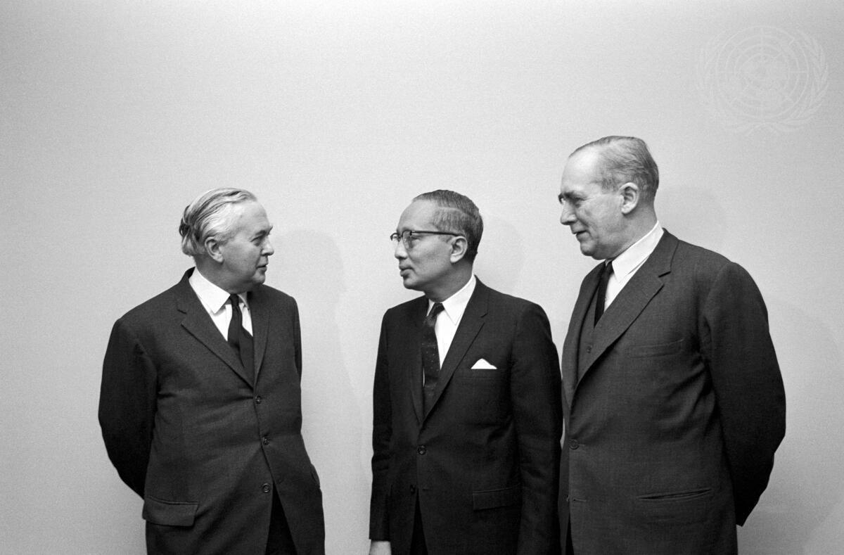Mr. Wilson (left) conversing with Secretary-General U Thant. At right is Lord Caradon, Minister of State for Foreign Affairs and Permanent Representative of the United Kingdom to the United Nations.