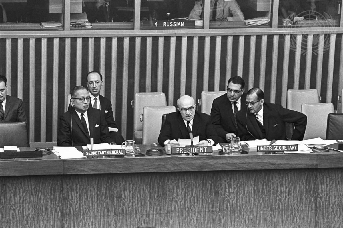 Assembly President, Amintore Fanfani (Italy), making a statement. At the table with him are: Secretary-General U Thant (left); and C. V. Narasimhan (right), Under-Secretary for General Assembly Affairs and Chef de Cabinet. In the back row are: Jose Rolz-Bennett (left), Under-Secretary for Special Political Affairs; and Leo Malania, Chief Editor, Office of the Secretary General.
