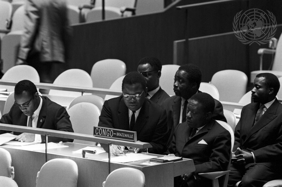 Here, members of the Delegation of Congo (Brazzaville) are seen in the Assembly Hall as they attended the meeting. Heading the Delegation is Ambassador Jonas Mouanza (right), Permanent Reprseentative to the UN.