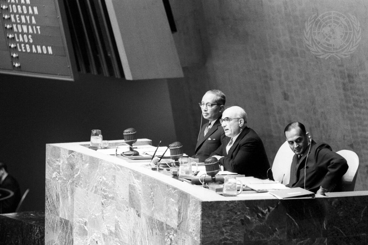 The new President, Amintore Fanfani (centre), is seen addressing the Assembly. With him at the presidential rostrum are: Secretary-General U Thant (left); and C.V. Narasimhan, UN Under-Secretary for Assembly Affairs and Chef de Cabinet.