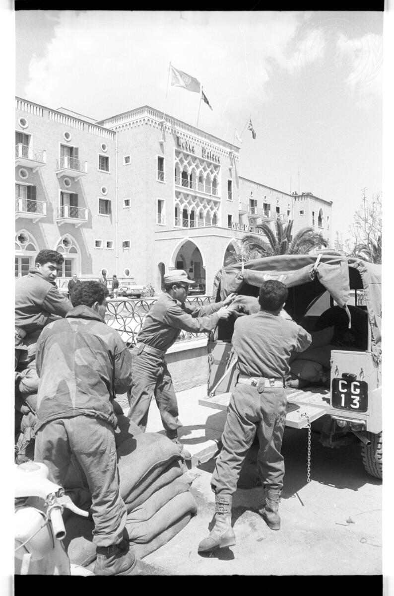 Sandbags being removed from the area outside the Ledra Palace Hotel.