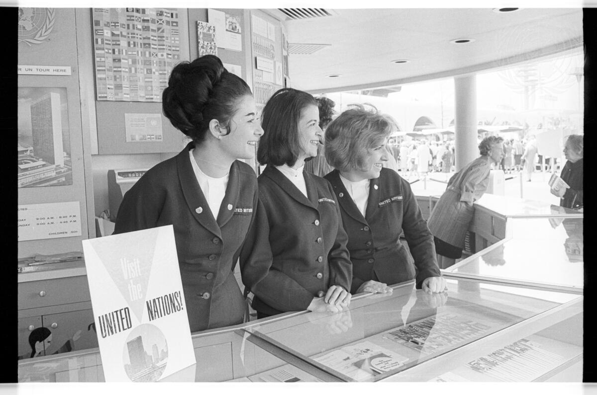 Three UN volunteers, serving as hostesses, are seen at the UNICEF Pavilion at the World's Fair. These guides are on duty to sell tickets, make reservations for prospective visitors to United Nations Headquarters, and answer public inquiries.