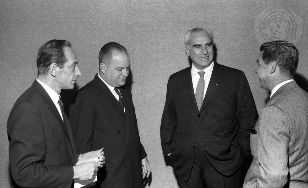 Seen conversing together during a recess of the meeting, (left to right) Mr. Lengyel, Press Attache to the delegation of Brazil; Mr. João Augusto de Araújo Castro, Minister of Foreign Affairs; Mr. Hernane Tavares de Sa; and Mr. Jose Quijano (UN).