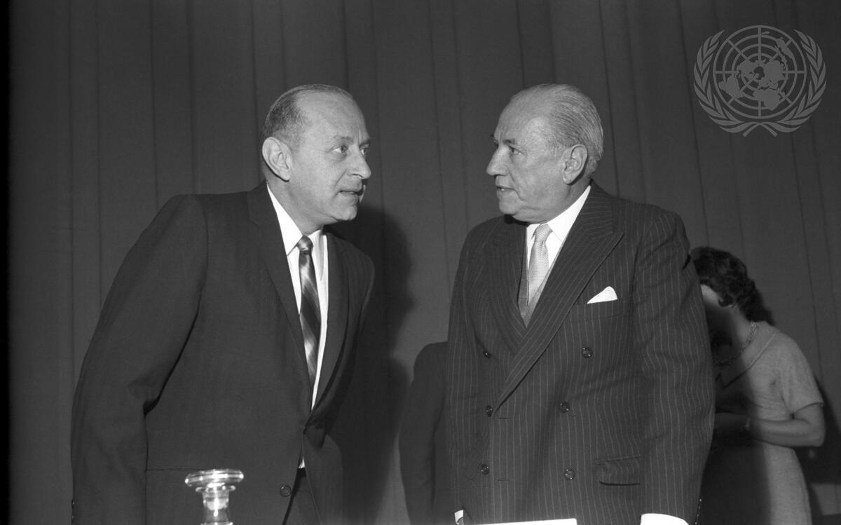 Conferring together, Under-Secretary of Economic and Social Affairs Philippe de Seynes (left) and Raúl Prebisch, Secretary-General of the UN Conference on Trade and Development.