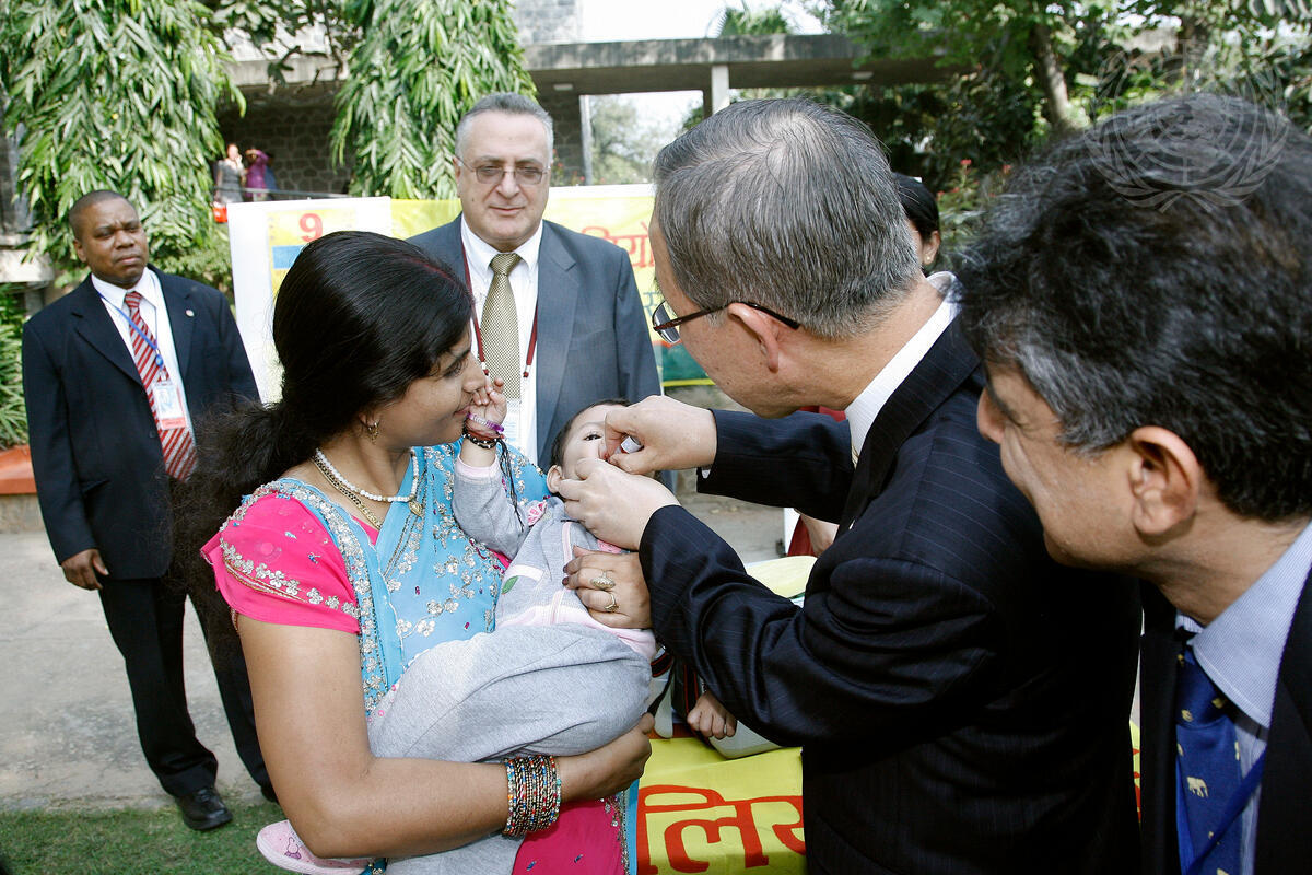 Secretary-General Ban Ki-moon administers a dose of a polio vaccine to a child brought by its mother to the United Nations complex.