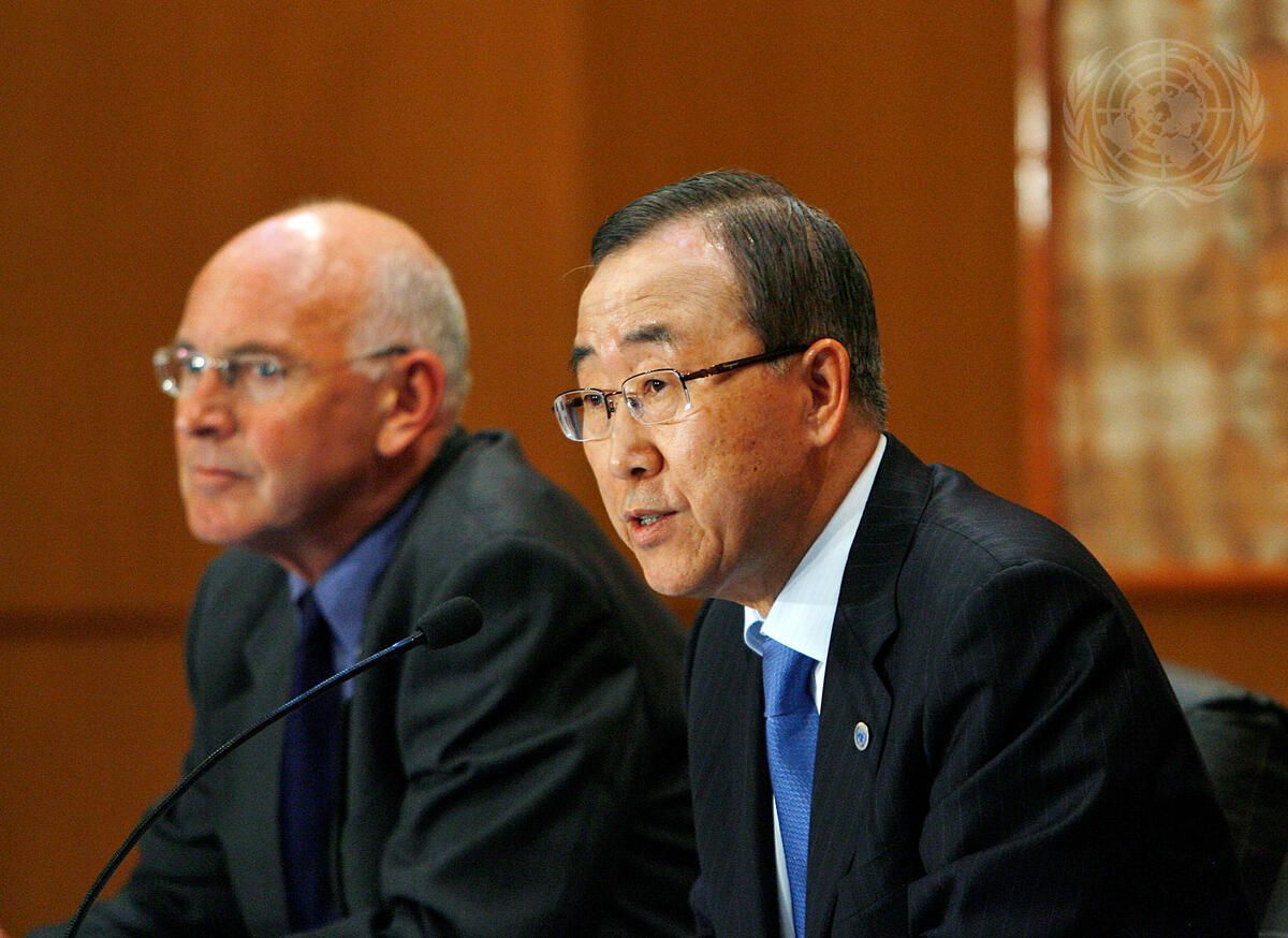 Secretary-General Ban Ki-moon (right), joined by Ian Martin, Special Representative of the Secretary-General and Head of the United Nations Political Mission in Nepal (UNMIN), addresses a press conference.