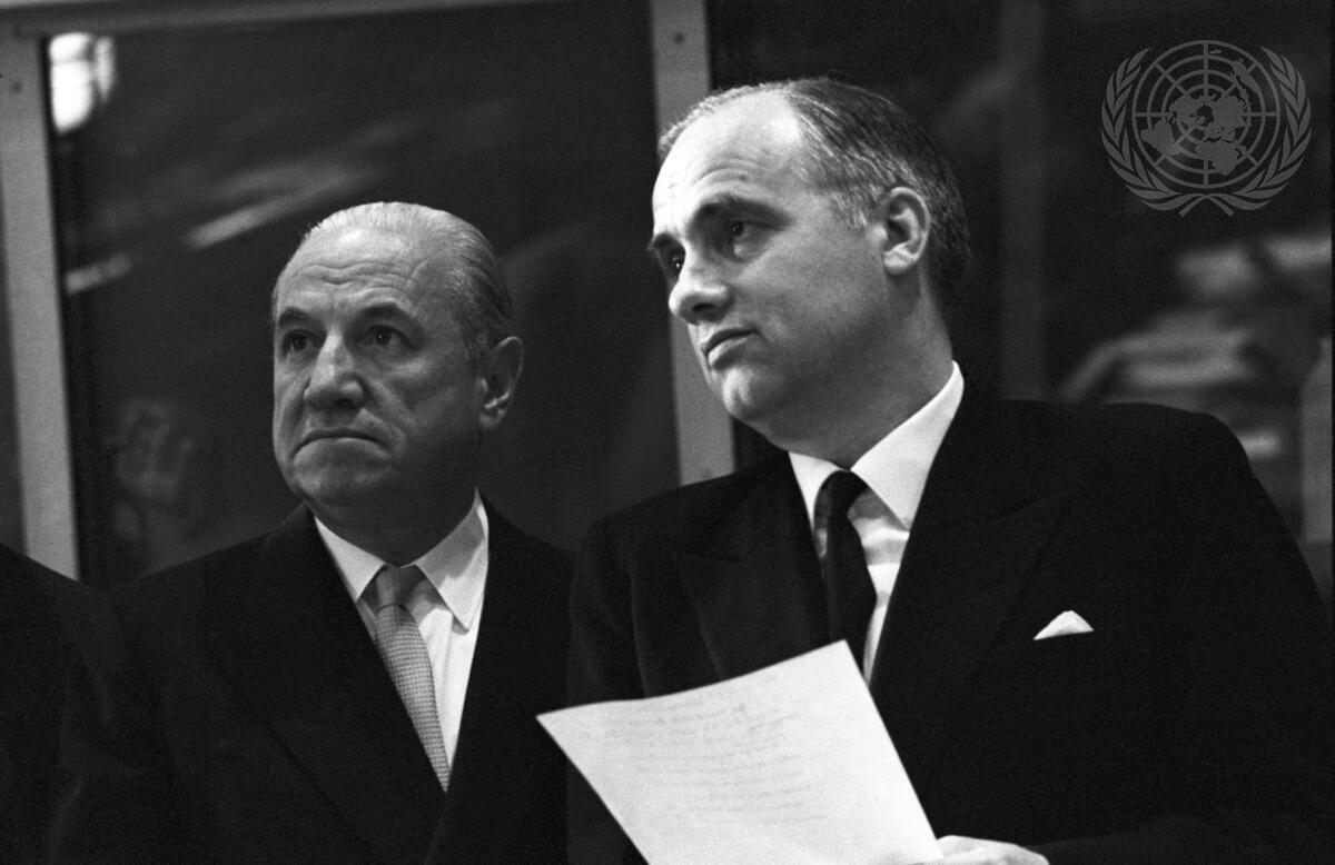 Seen here are Dr. Raúl Prebisch (left), Secretary-General of the forthcoming U.N. Conference on Trade and Development, and Mr. A. Rosenstand Hansen (Denmark), Chairman of the Committee.