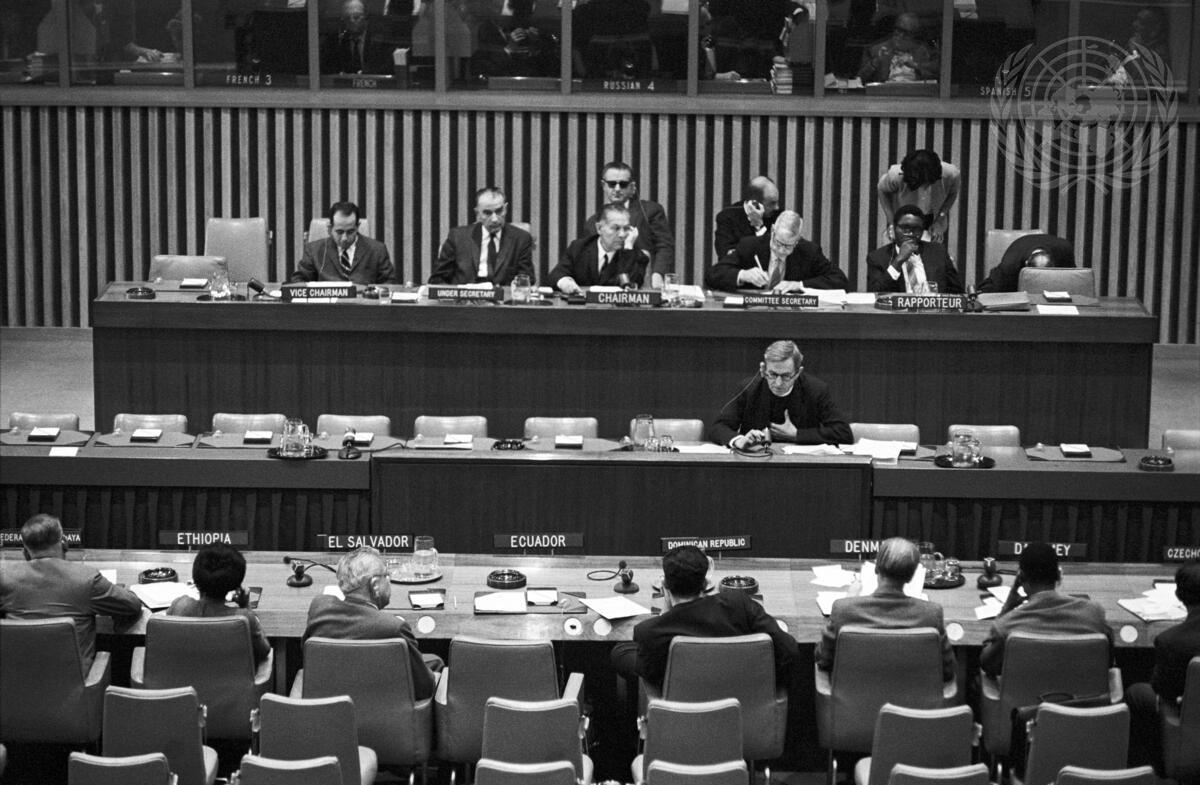 View of a section of the conference room during the meeting. Seen at the center table is the Reverend Michael Scott. At the table in the background are (l. to r.): Dr. Mohied Din Nabavi (Iran), Vice-Chairman; Dr. D. Protitch, Under-Secretary for the UN Department of Trusteeship and Information from Non-Self-Governing Territories; Col. Guillermo Flores Avendano (Guatemala), Chairman; Mr. Frank W. Cottrell, Committee Secretary; and Mr. S.H.O. Ibe (Nigeria), Rapporteur.