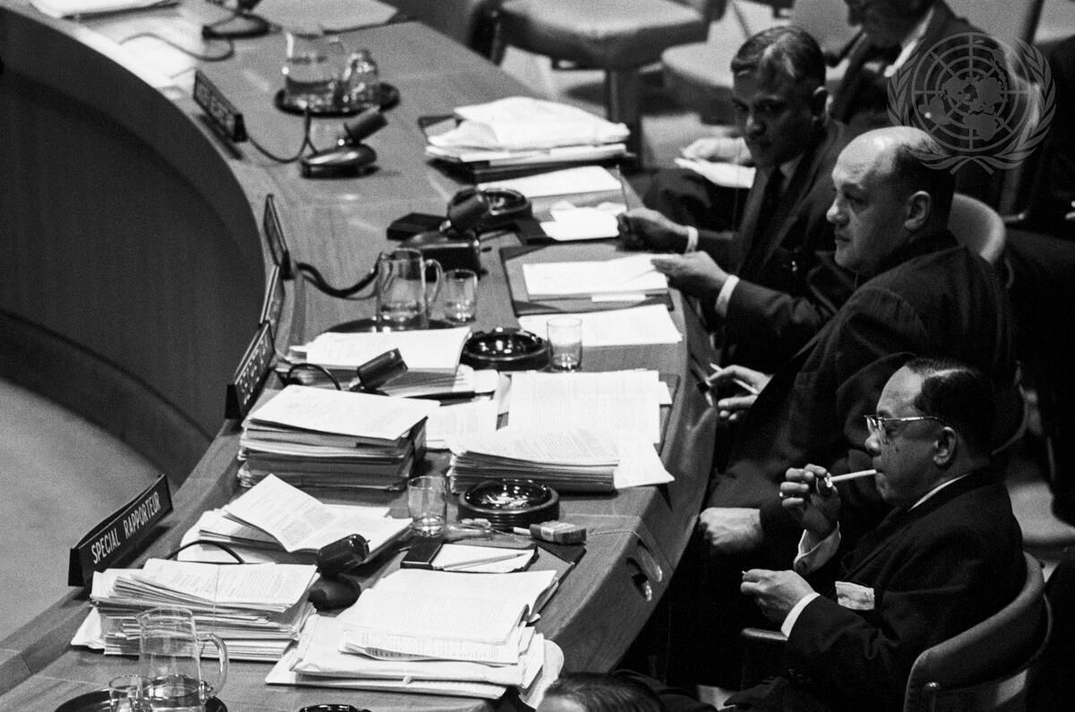 Seen here, left to right: Mr. Arcot Krishnaswami (India), Chairman; Mr. Edward Lawson of the UN Division of Human Rights, Secretary; and Mr. Jose D. Ingles (Philippines), Special Rapporteur who had introduced a study of discrimination in regard to the right of any person to leave any country, including his or her own, and to return to his or her country.