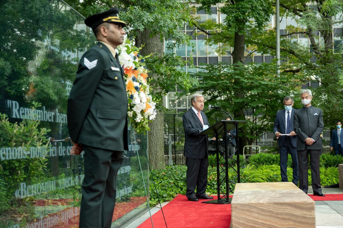 Secretary-General António Guterres (at podium) addresses a solemn ceremony ahead of the Security Council High-level Open Debate on UN Peacekeeping Operations: Technology and Peacekeeping. At right is Subrahmanyam Jaishankar, Minister for External Affairs of the Republic of India.