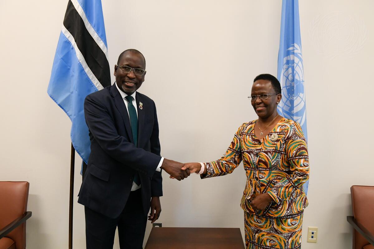 Collen Vixen Kelapile (left), President of the Economic and Social Council (ECOSOC) and Permanent Representative of Botswana to the United Nations, meets with Liberata Mulamula, Minister for Foreign Affairs and East African Cooperation of the United Republic of Tanzania.
