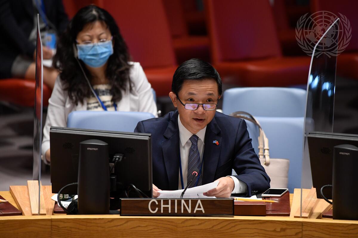 Dai Bing, Deputy Permanent Representative of the People’s Republic of China to the United Nations, addresses the Security Council meeting on threats to international peace and security caused by terrorist acts. The Council hears the thirteenth report of the Secretary-General on the threat posed by ISIL (Da’esh) to international peace and security and the range of United Nations efforts in support of Member States in countering the threat (S/2021/682).