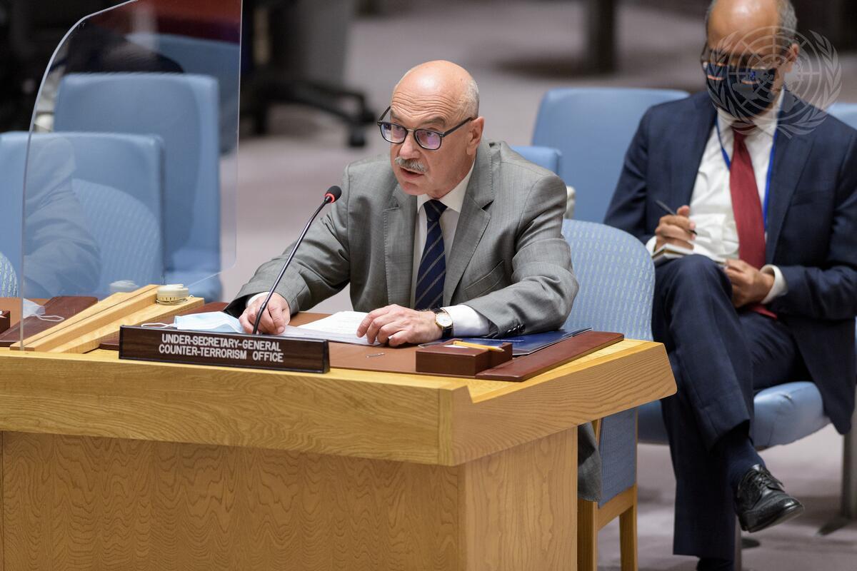 Vladimir Voronkov, Under-Secretary-General of the United Nations Office of Counter-Terrorism, briefs the Security Council meeting on threats to international peace and security caused by terrorist acts. The Council hears the thirteenth report of the Secretary-General on the threat posed by ISIL (Da’esh) to international peace and security and the range of United Nations efforts in support of Member States in countering the threat (S/2021/682).