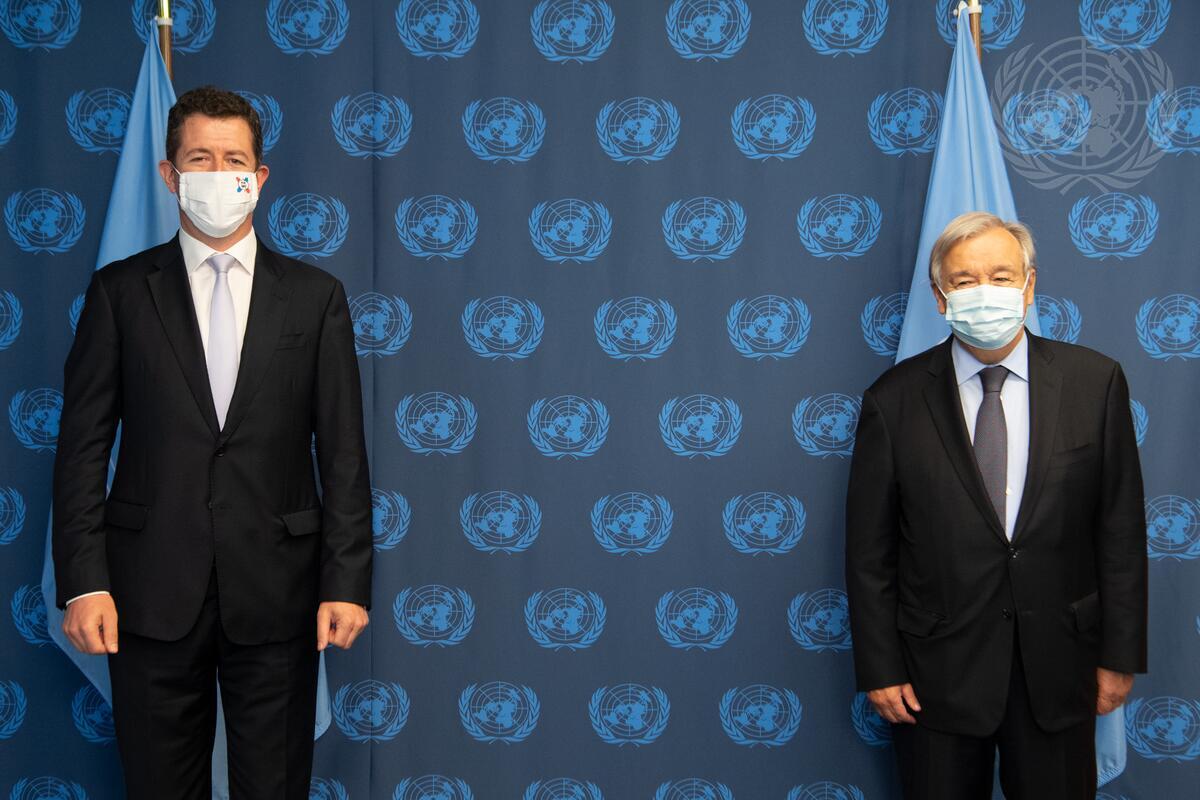 Olivier Maes (left), Permanent Representative of Luxembourg to the United Nations, presents his credentials to Secretary-General António Guterres.