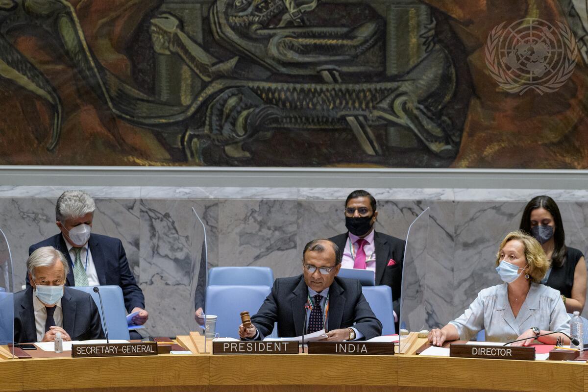 T.S. Tirumurti (centre), Permanent Representative of India to the United Nations and President of Security Council for the month of August, chairs the Security Council meeting on the situation in Afghanistan.