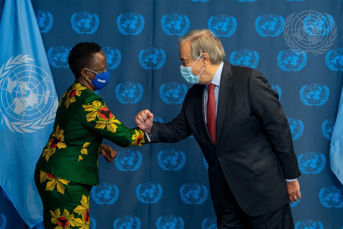 Secretary-General António Guterres (right) meets with Liberata R. Mulamula, Minister for Foreign Affairs and East African Cooperation of the United Republic of Tanzania.