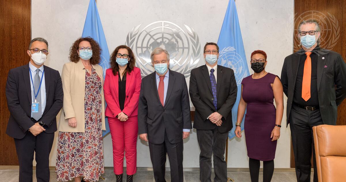 Secretary-General António Guterres (centre) meets with Prisca Chaoui, President of the Coordination Committee of International Staff Unions and Associations of the United Nations System; Mark Polane, President of the United Nations Field Staff Union and President of the United Nations International Civil Servants Federation; and Tanya Quinn-Maguire, President of the Federation of International Civil Servants’ Association.