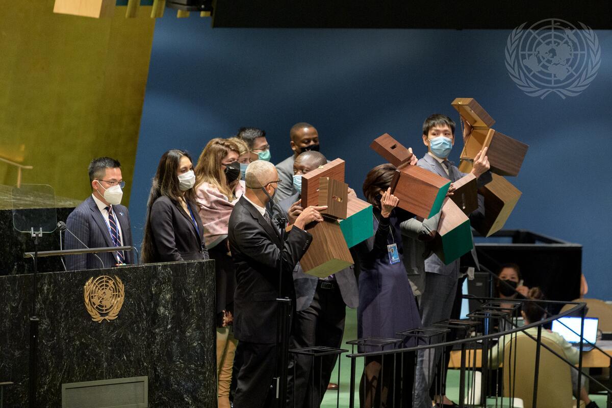 Staff members and delegates verify that ballot boxes are empty during the General Assembly meeting on Fifth Committee and appointments to fill vacancies in subsidiary organs and other appointments.