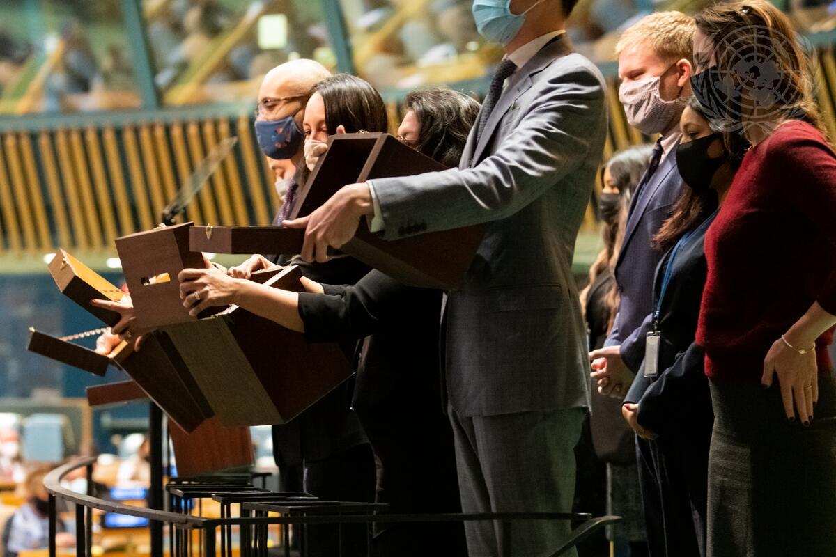 Delegates submit voting ballots during the General Assembly plenary meeting for voting on the election of a member of the International Court of Justice.