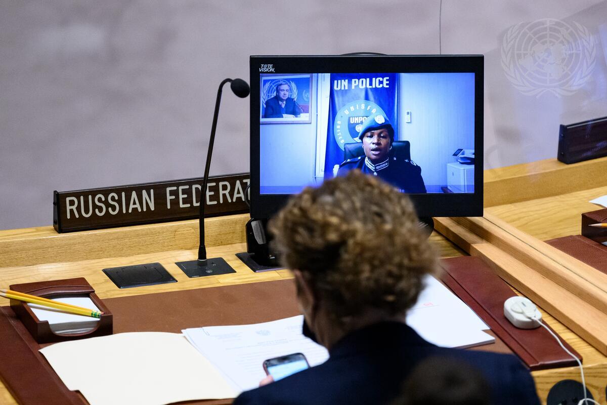 Violet Lusala (on screen), Police Commissioner, United Nations Interim Security Force for Abyei (UNISFA), briefs the Security Council meeting on United Nations peacekeeping operations and Police Commissioners.