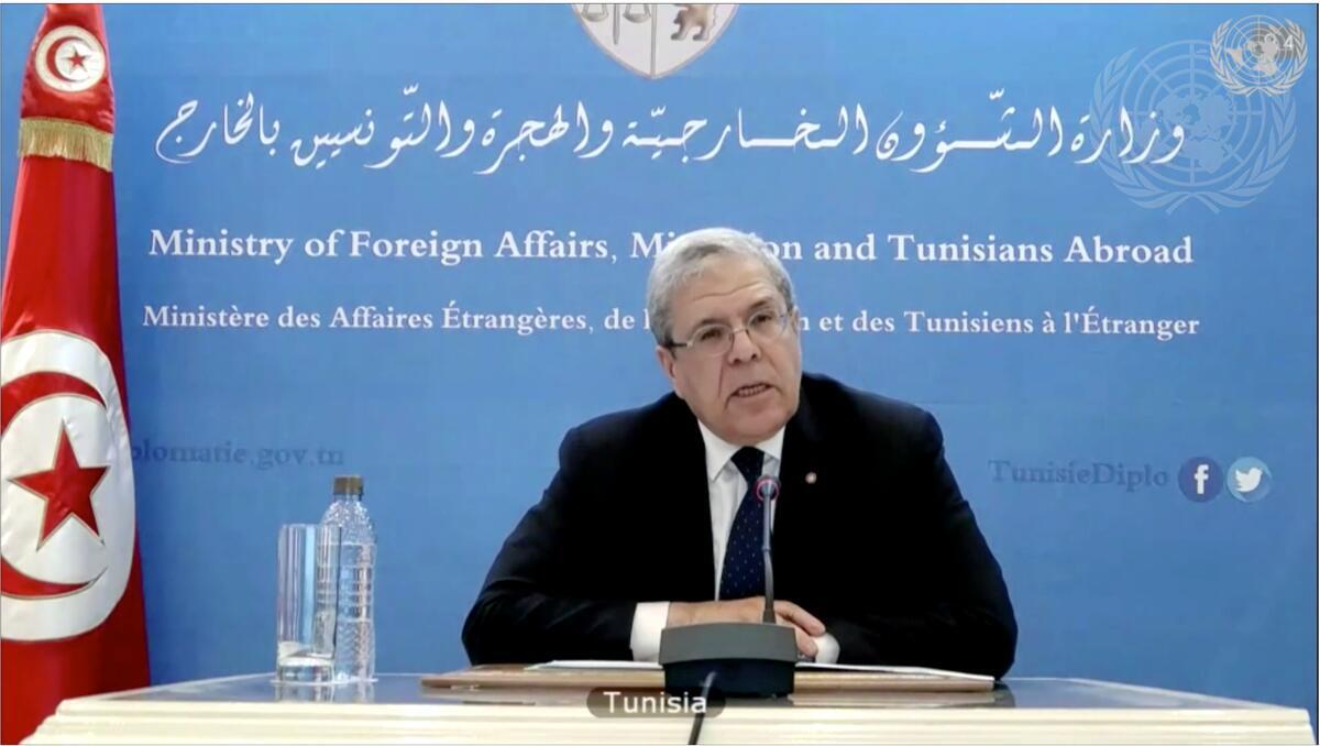 Othman Jerandi, Minister for Foreign Affairs, Migration and Tunisians Abroad of Tunisia, addresses the Security Council VTC open debate in connection with the situation in the Middle East, including the Palestinian question.