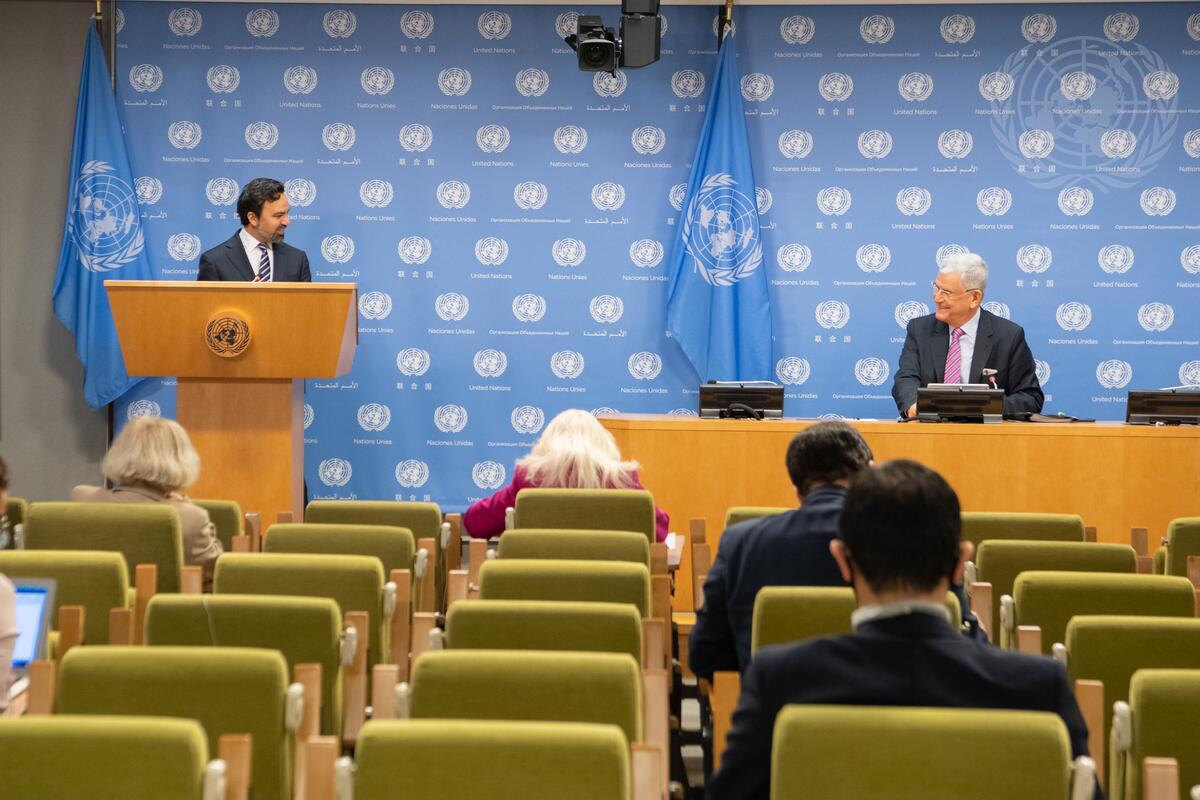 Volkan Bozkir (right), President of the seventy-fifth session of the United Nations General Assembly, briefs reporters.