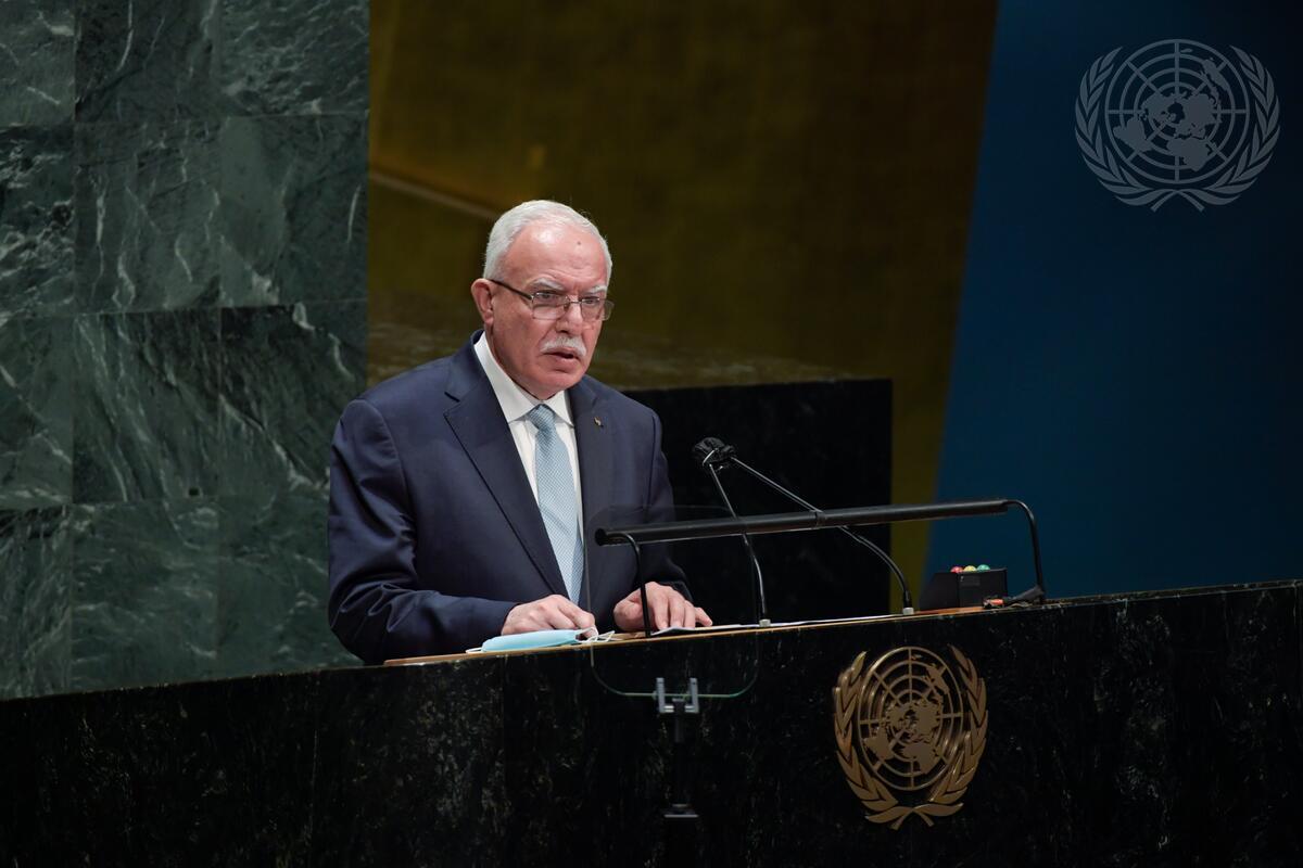 Riad Al-Malki, Minister of Foreign Affairs and Expatriates of the State of Palestine, addresses the General Assembly meeting on the situation in the Middle East and the question of Palestine.