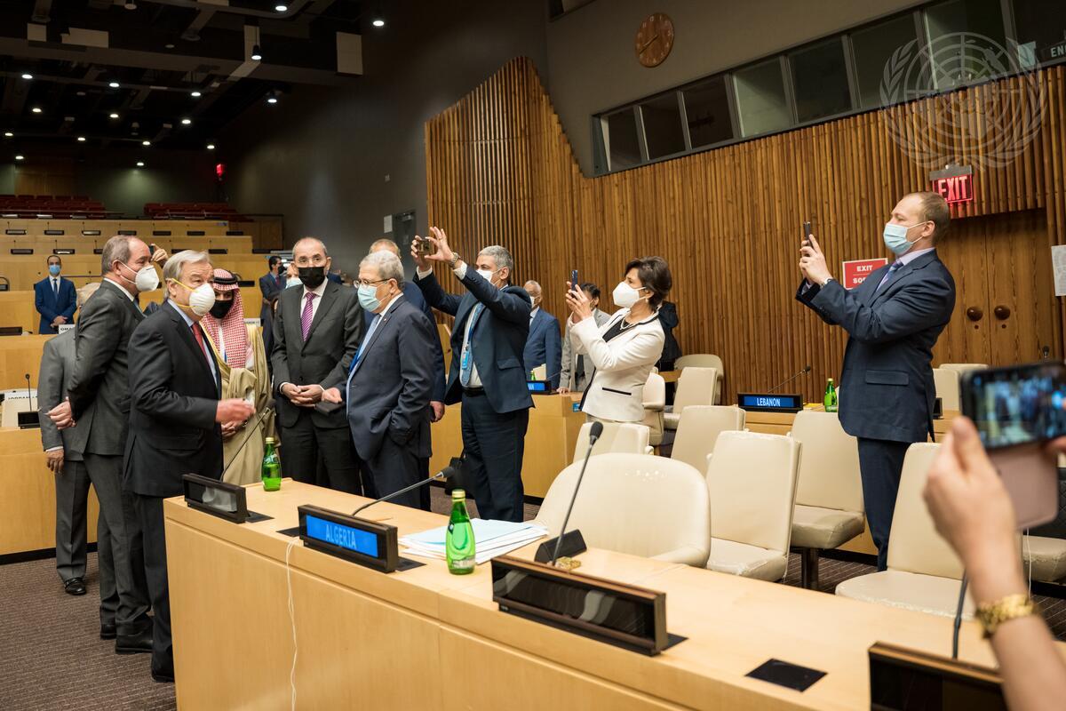 Secretary-General António Guterres (second from left) meets with the Ministers of Foreign Affairs of the League of Arab States.