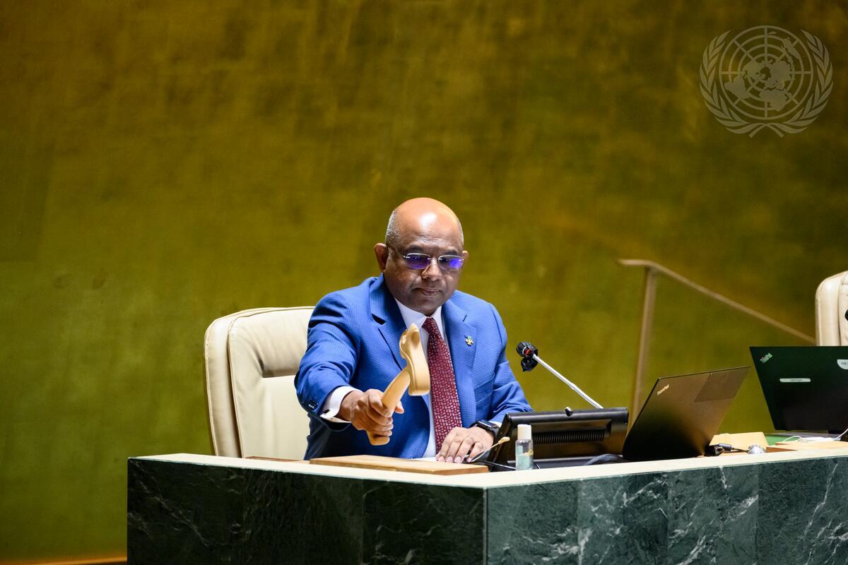 Abdulla Shahid, President of the seventy-sixth session of the United Nations General Assembly, chairs the 2nd plenary meeting of the 76th session of the General Assembly. The meeting dealt with the organization of work, adoption of the agenda, reports of the General Committee, and a comprehensive implementation of and follow-up to the Durban Declaration and Programme of Action.