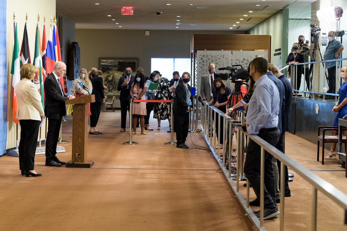 Mona Juul (left), Permanent Representative of Norway to the United Nations, and Sven Jürgenson (at podium), Permanent Representative of the Republic of Estonia to the United Nations, brief reporters, as co-penholders on Afghanistan, on the extension of the United Nations Assistance Mission in Afghanistan (UNAMA).