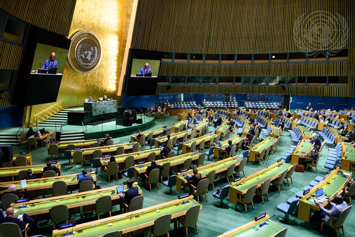 A wide view of the 2nd plenary meeting of the 76th session of the General Assembly. The meeting dealt with the organization of work, adoption of the agenda, reports of the General Committee, and a comprehensive implementation of and follow-up to the Durban Declaration and Programme of Action.