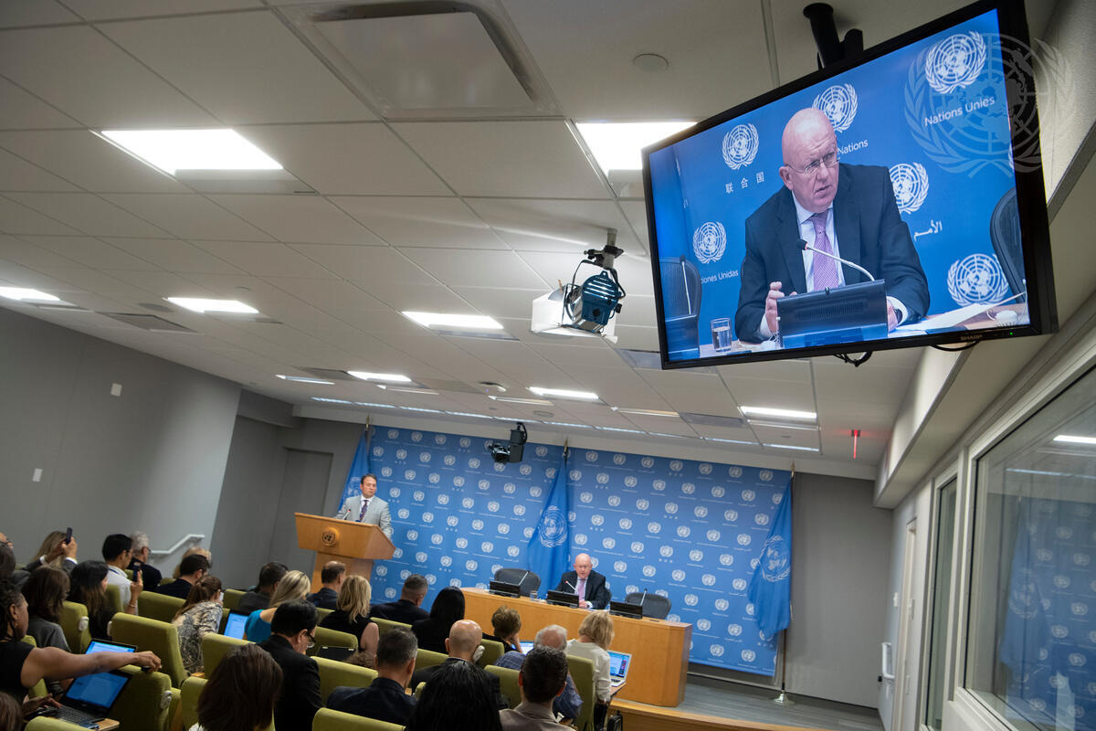 Vassily Nebenzia (on screen and seated at dais), Permanent Representative of the Russian Federation to the United Nations and President of the Security Council for the month of September, briefs journalists on the Council’s programme of work for the month.