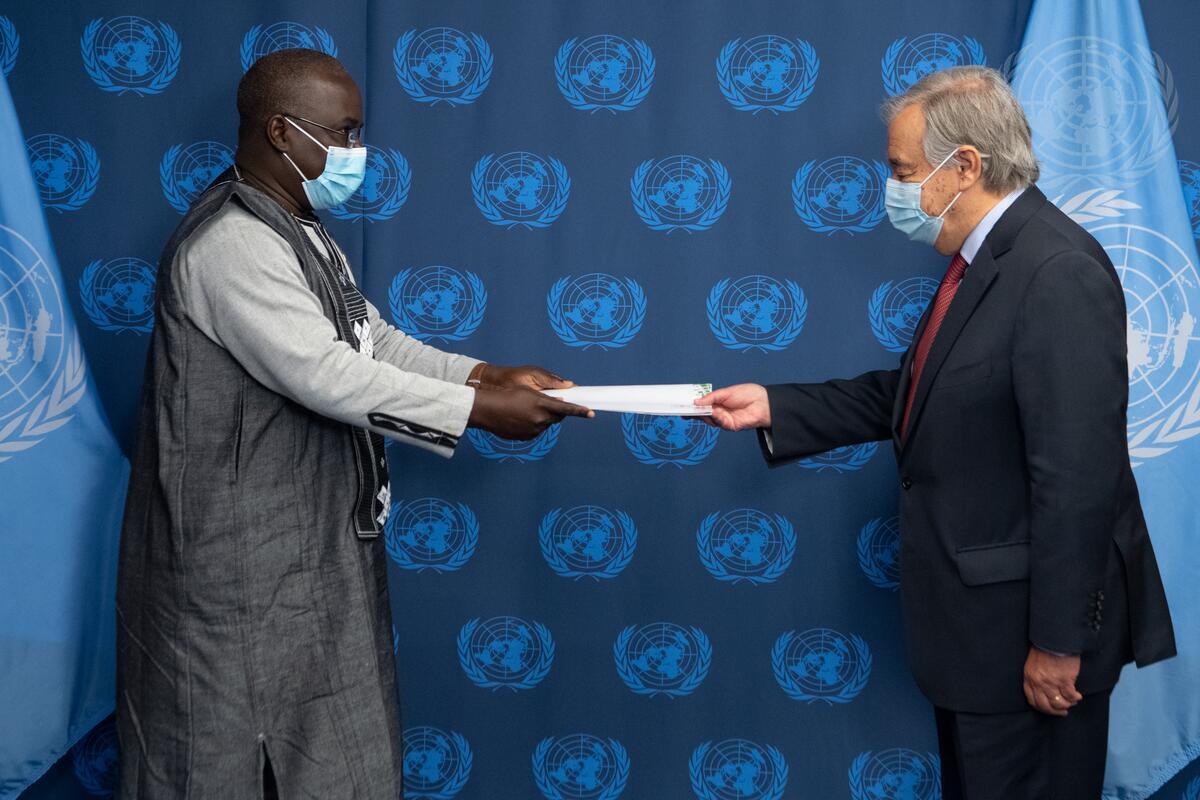 Seydou Sinka (left), Permanent Representative of Burkina Faso to the United Nations, presents his credentials to Secretary-General António Guterres.