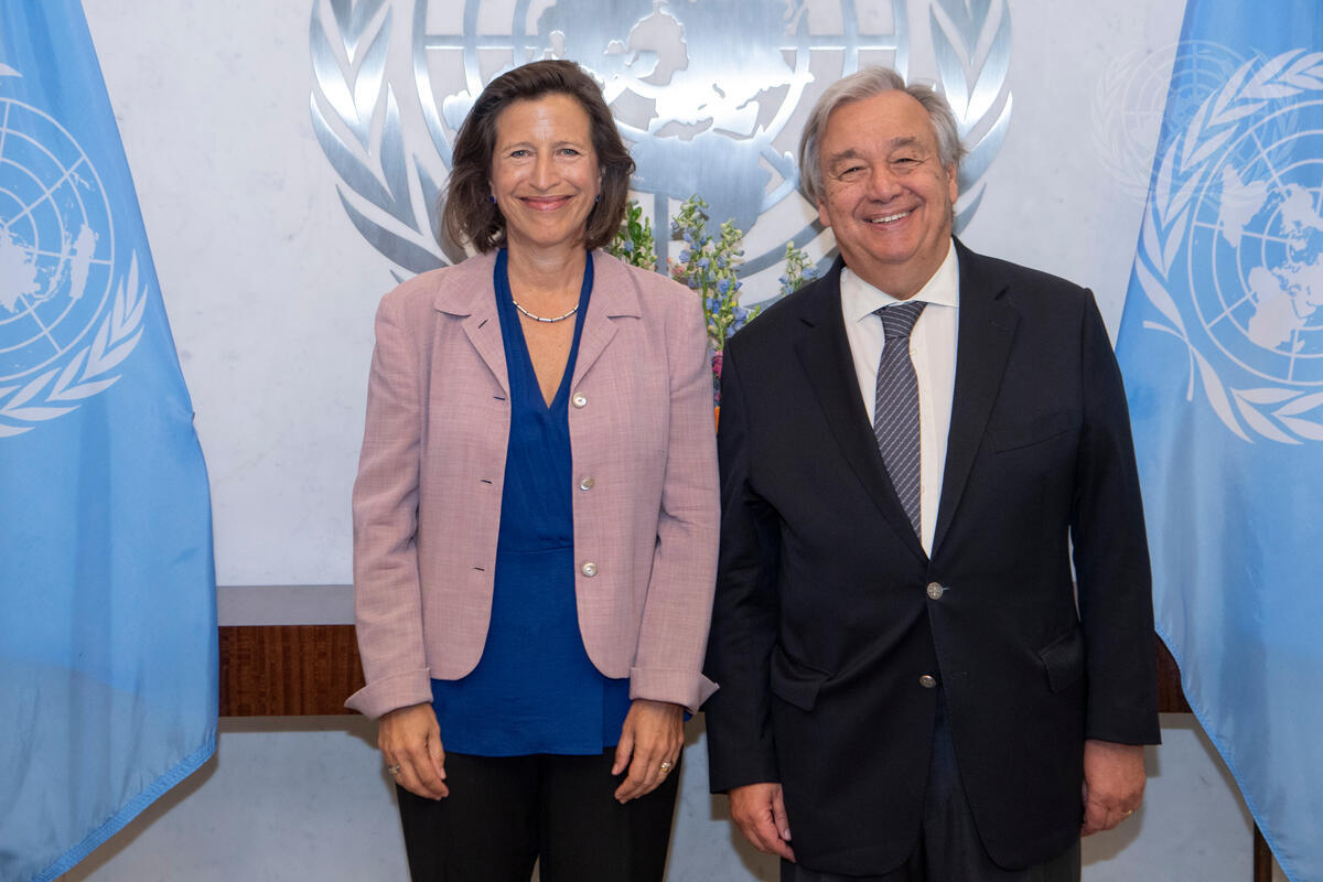 Secretary-General António Guterres (right) swears in Melissa Fleming, Under-Secretary-General for Global Communications.