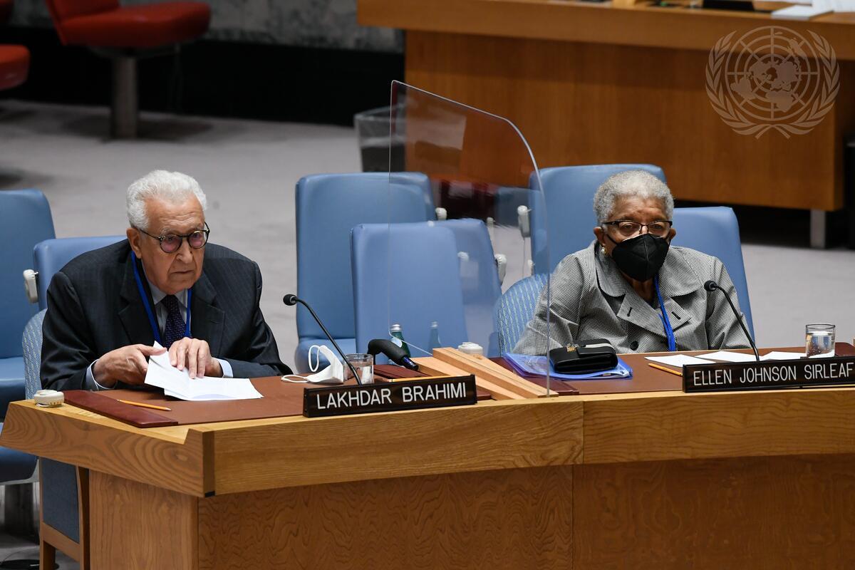 Lakhdar Brahimi, Elder Emeritus of The Elders, and Ellen Johnson Sirleaf, Member of The Elders, attend the Security Council meeting on maintenance of international peace and security.