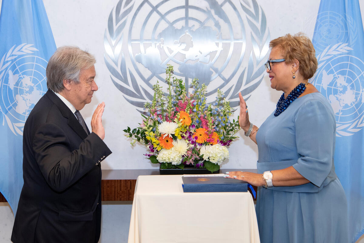 Secretary-General António Guterres (left) swears in Catherine Pollard, Under-Secretary-General for Management Strategy, Policy and Compliance.