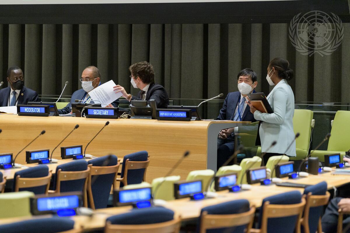 A view of the panel prior to the informal thematic consultation held by the General Assembly as a follow-up to the report of the Secretary-General entitled "Our Common Agenda ". This meeting is a second thematic cluster on the theme “Accelerating the SDGs through sustainable financing and building trust”.