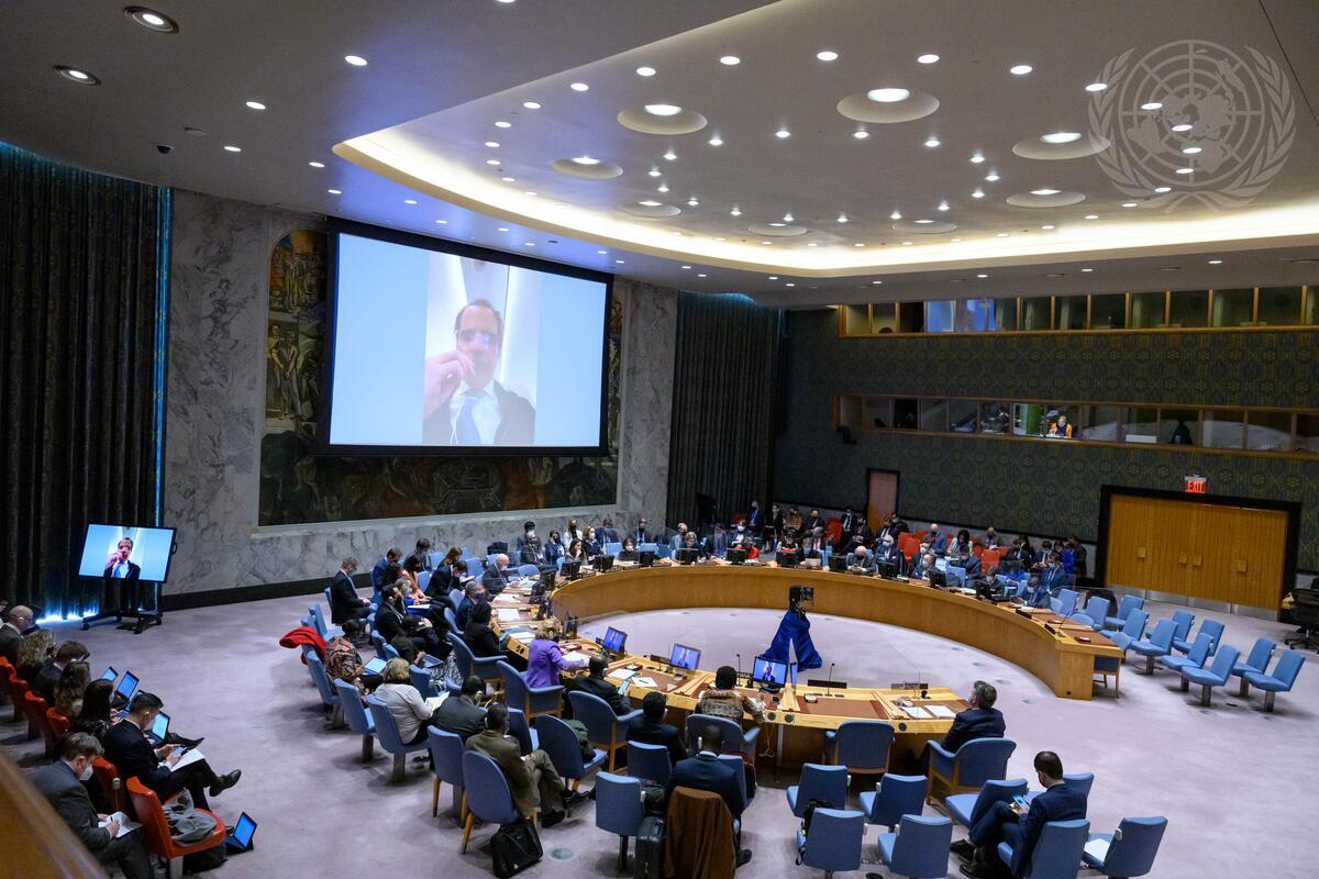 Rafael Mariano Grossi (on screen), Director General of the International Atomic Energy Agency, briefs the Security Council meeting on the situation in Ukraine.