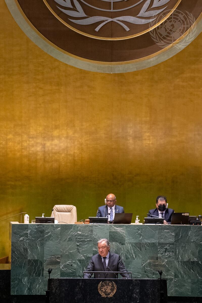 Secretary-General António Guterres (at podium) addresses the General Assembly informal thematic consultation as a follow-up to the report of the Secretary-General entitled "Our Common Agenda". This meeting is the 5th thematic cluster on the theme “Enhancing international cooperation”.