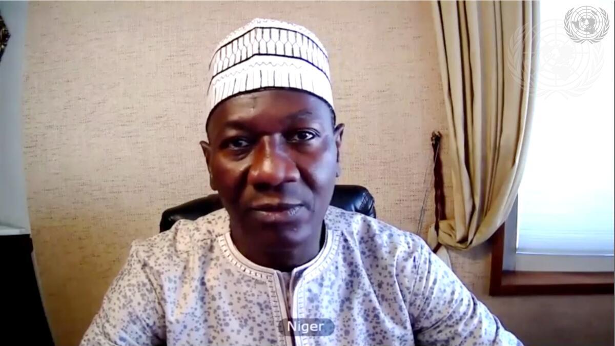 Aougui Niandou, Deputy Permanent Representative of Niger to the United Nations, addresses the videoconference with Security Council members in connection with the United Nations Multidimensional Integrated Stabilization Mission in Mali (MINUSMA).