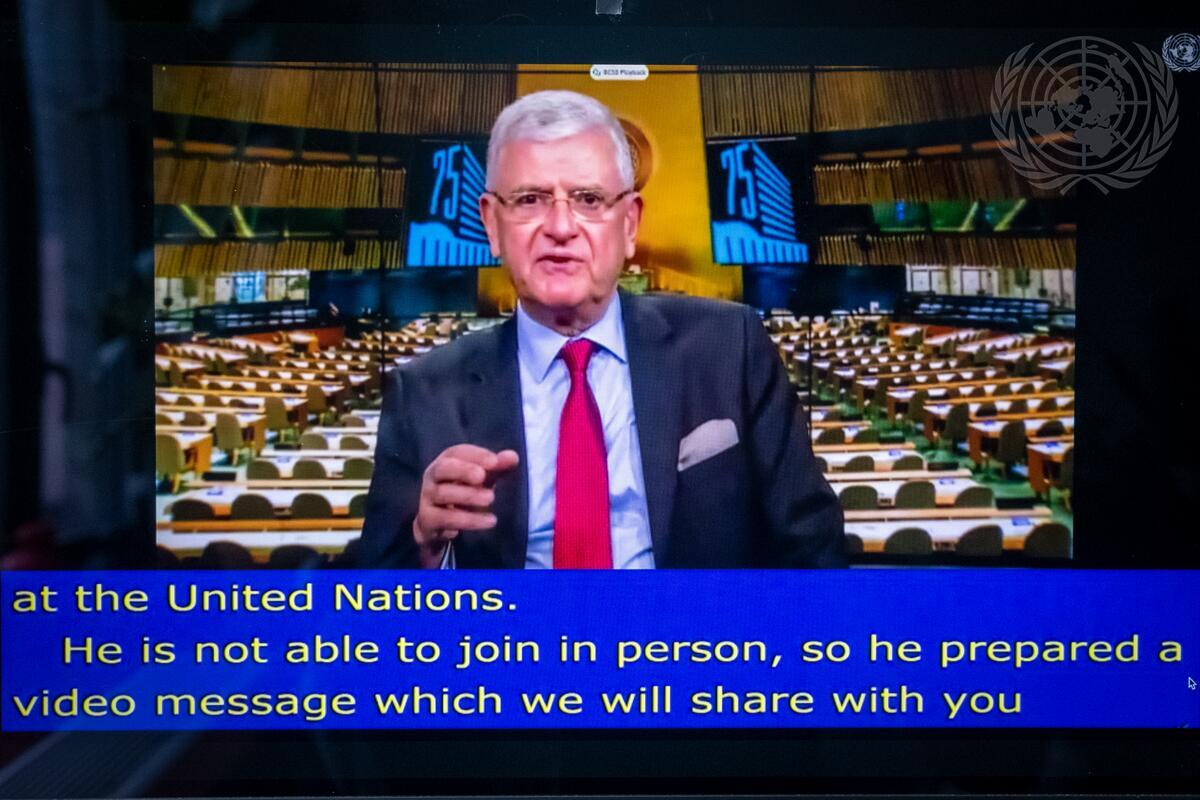 Volkan Bozkir, President of the seventy-fifth session of the United Nations General Assembly, addresses the panel briefing “Delivering Critical Assistance for Palestine Refugees: Challenges and Opportunities in a Complex Context”, with Philippe Lazzarini, Commissioner-General of the United Nations Relief and Works Agency for Palestine Refugees in the Near East (UNRWA), and Gwyn Lewis, Director of UNRWA Operations West Bank.
