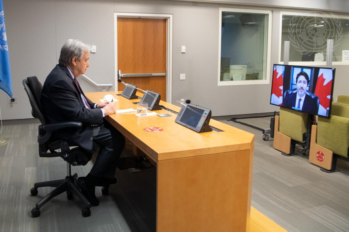 Secretary-General António Guterres (left) briefs reporters together with Andrew Holness (not pictured), Prime Minister of Jamaica, and Justin Trudeau (on screen), Prime Minister of Canada, on the meeting on "Financing for Development in the Era of COVID-19 and Beyond".