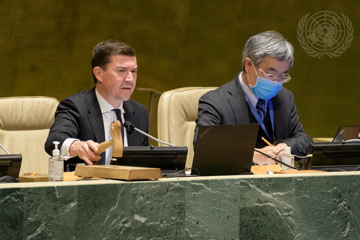 James Paul Roscoe, Vice-President of the seventy-sixth session of the UN General Assembly and Ambassador for General Assembly Affairs of the United Kingdom to the United Nations, chairs the General Assembly meeting that heard reports of the Economic and Social Council (ECOSOC), the International Atomic Energy Agency (IAEA), and discussed the question of equitable representation on and increase in the membership of the Security Council and other matters related to the Security Council.