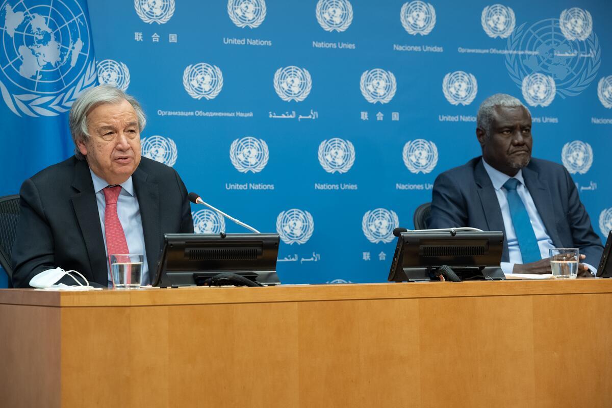 Secretary-General António Guterres (left) and Moussa Faki Mahamat, Chairperson of the African Union Commission. hold a press conference on the fifth African Union-United Nations Annual Conference.