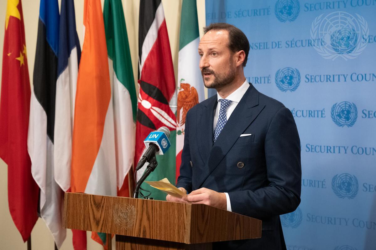 Crown Prince Haakon of Norway briefs reporters ahead of the Security Council Arria Formula meeting on the Protection of Education in Conflict.