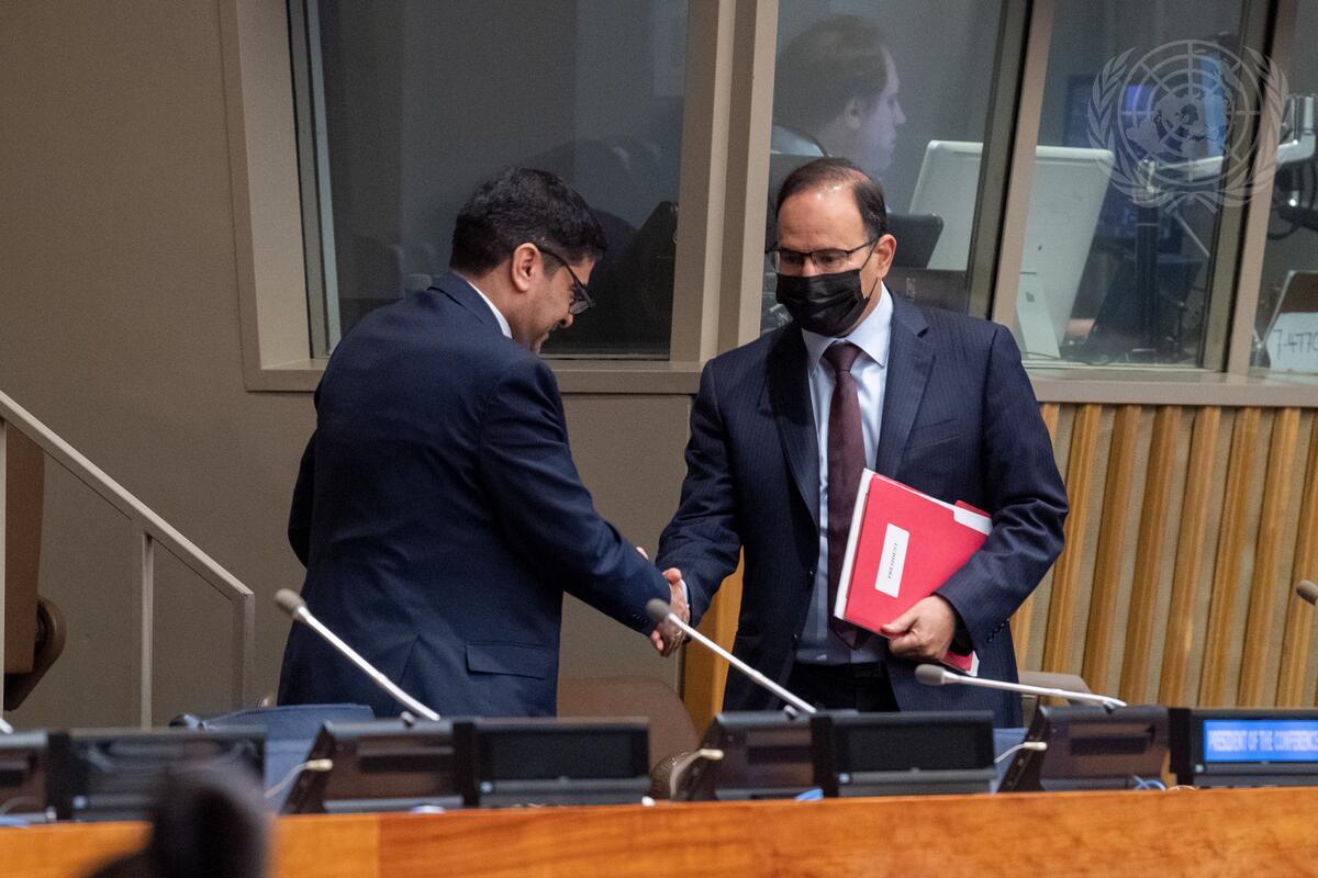 Mansour Ayyad Al-Otaibi (right), Permanent Representative of the State of Kuwait to the United Nations, and incoming President of the Conference on the Establishment of a Middle East Zone Free of Nuclear Weapons and Other Weapons of Mass Destruction, greets Sudqi Al Omoush, Deputy Permanent Representative of Jordan to the United Nations and outgoing President, during the Conference on the Establishment of a Middle East Zone Free of Nuclear Weapons and Other Weapons of Mass Destruction (29 November-3 December 2021).