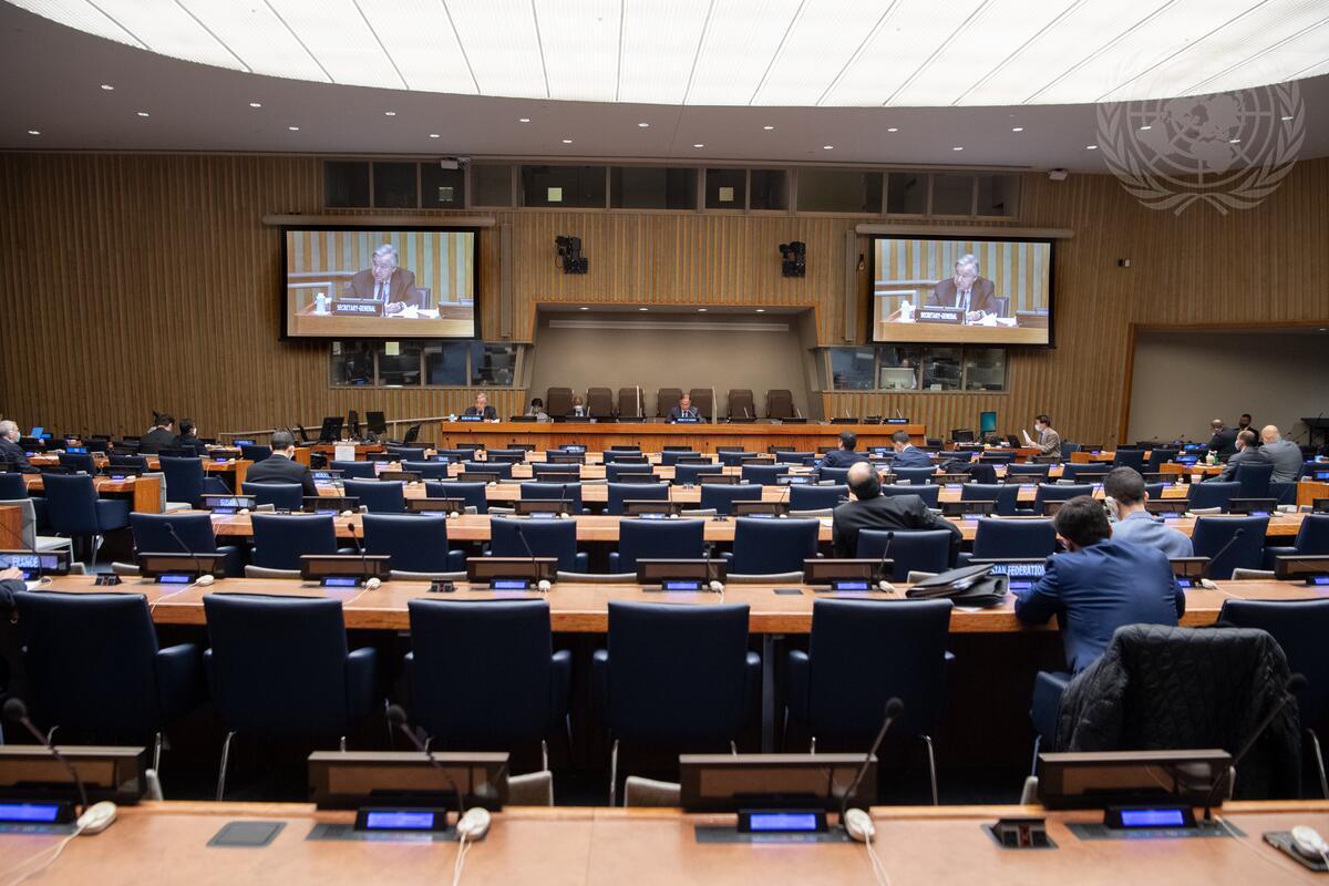 A wide view of the room as Secretary-General António Guterres (on screens) addresses the Conference on the Establishment of a Middle East Zone Free of Nuclear Weapons and Other Weapons of Mass Destruction (29 November-3 December 2021).